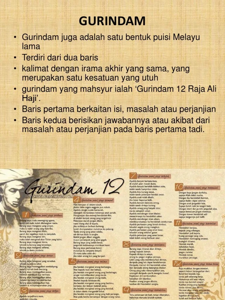 Apabila anak tak dilatih jikalau besar bapaknya letih. Istilah gurindam berasal dari bahasa india, yaitu kirindam berarti "mulamula" atau "perumpamaan". Gurindam adalah puisi lama yang berasal dari negeri india. Berikut salah satu contoh gurindam: كسوسسترأن) merujuk kepada hasil seni yang disampaikan melalui bahasa.dari segi etimologi, kesusasteraan berasal daripada cantuman kata 'su' dan 'sastra' dalam bahasa sanskrit yang bermaksudnya karya yang indah dan berguna.